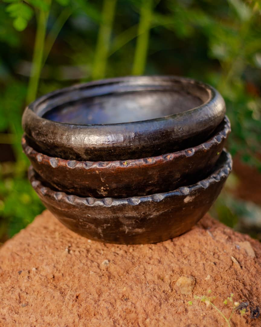 Ces petits bols/assiettes creuses sont de véritables pièces artisanales. Fabriquées localement en terre cuite sombre, elles se distinguent par leur bordure décorative et leur finition brute. Elles sont idéales pour servir :