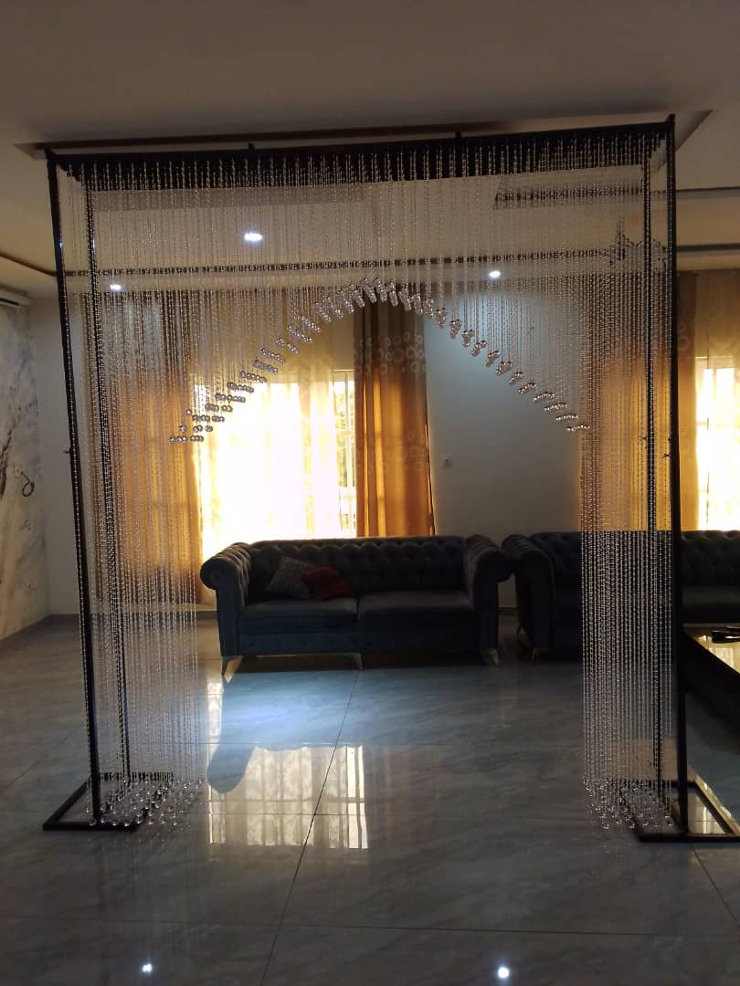 Ce séparateur d’espace est un élément de décoration ultra-chic qui attire tous les regards. Composé d’un cadre noir robuste et de longues chaînes de perles acryliques ou de cristal qui pendent élégamment, il crée une arche centrale spectaculaire. Il permet de diviser visuellement une grande pièce sans bloquer complètement la lumière ni la vue, ajoutant ainsi une dimension de profondeur et d’éclat à votre décor.